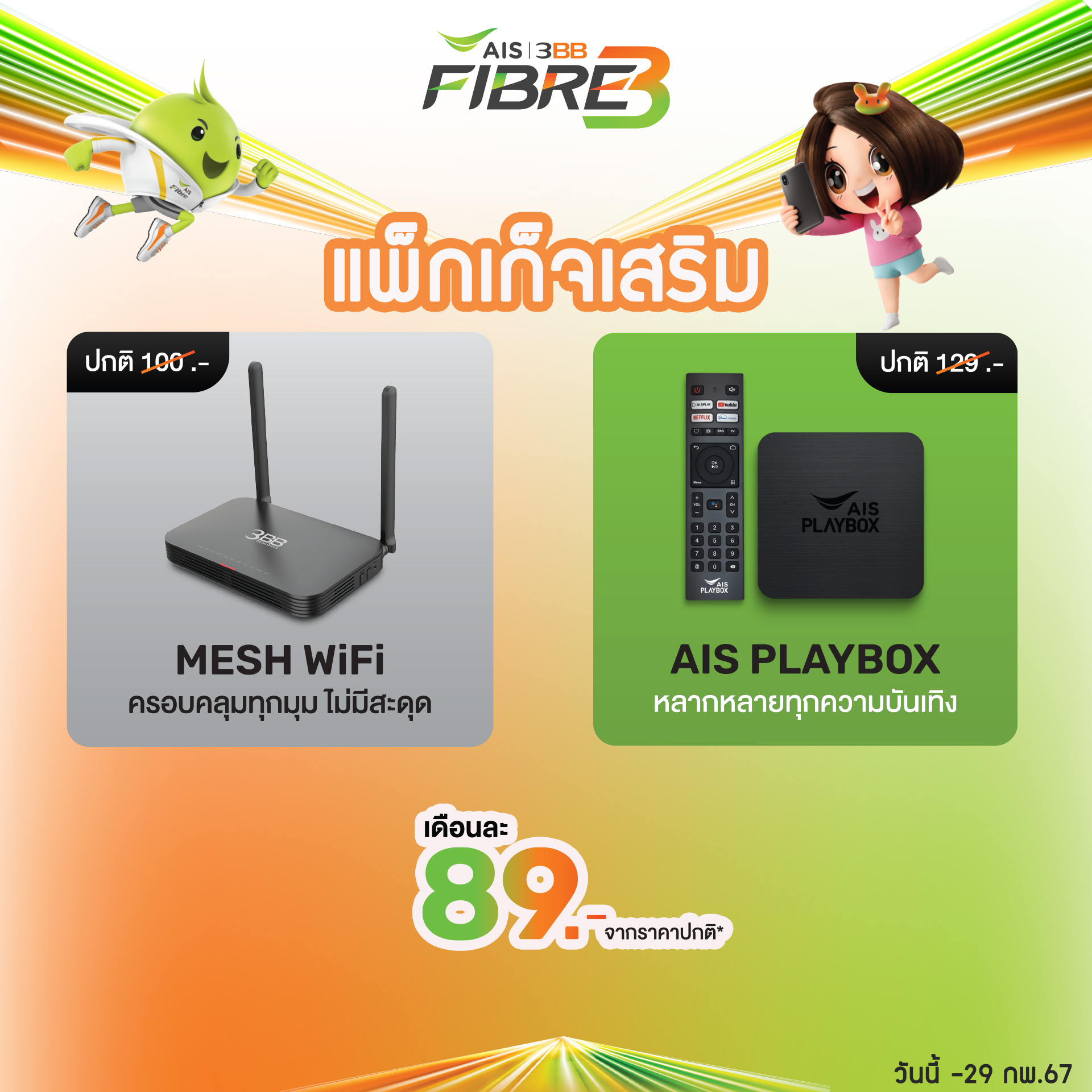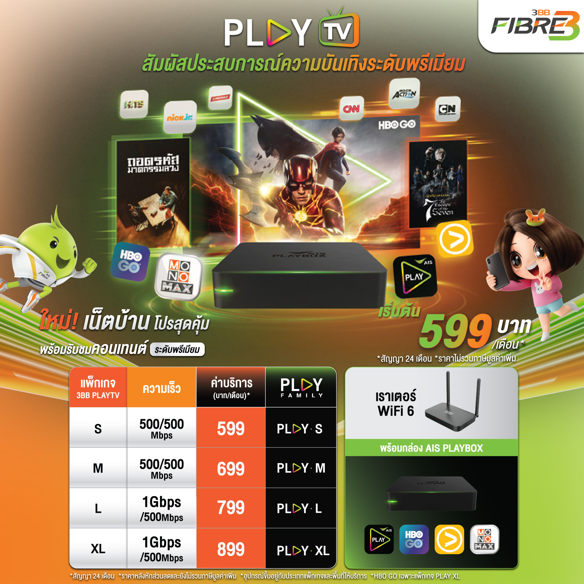 สัมผัสประสบการณ์ความบันเทิงระดับพรีเมี่ยมด้วยกล่อง Play Box และ MESH WIFI ครอบคลุมทุกมุมในบ้าน เร็วแรง ขยายสัญญาณแม้อยู่ในมุมอับ ไม่มีสะดุด เพียงเดือนละ 89 บาท
